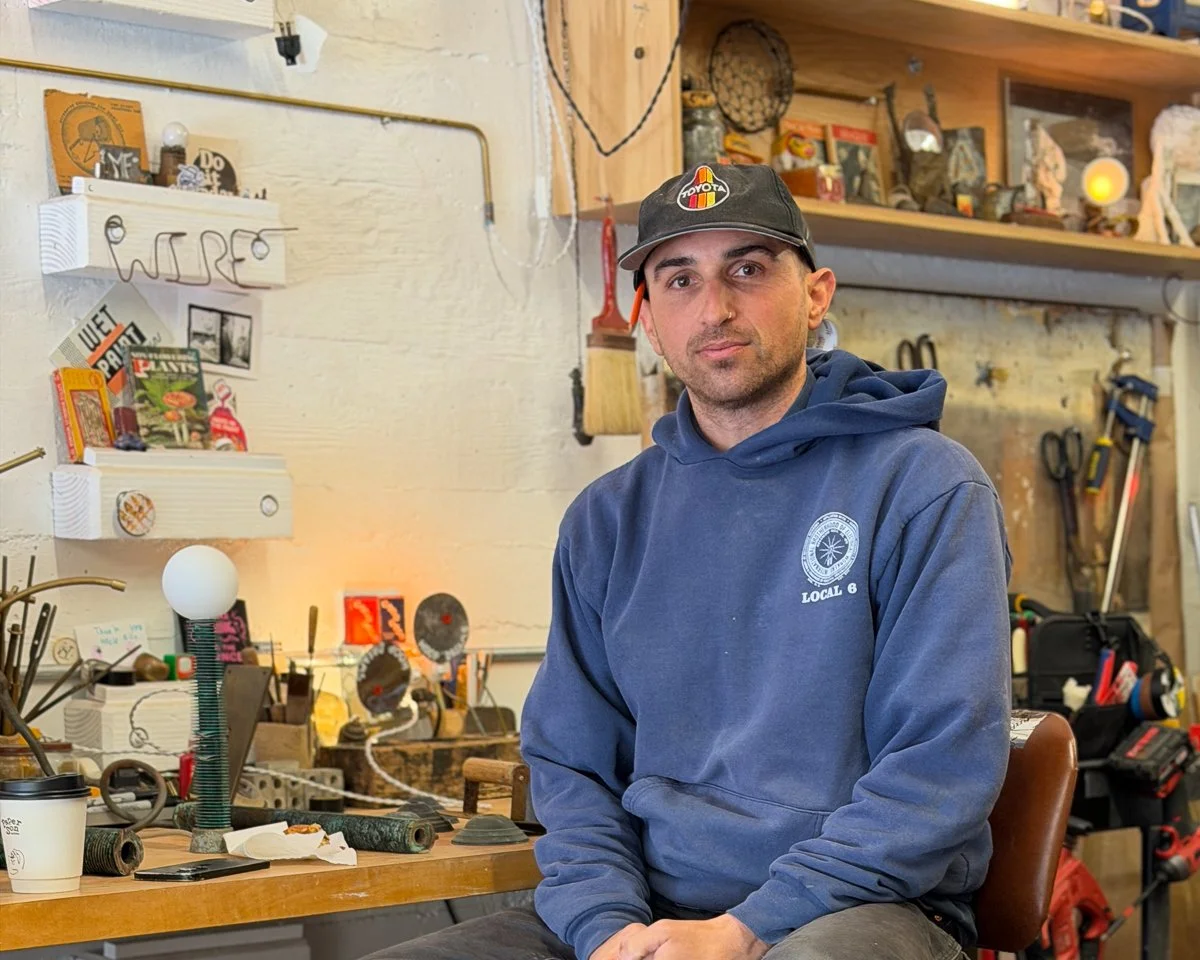 San Francisco–based artist and union electrician Rico Duenas builds a singular creative practice at the intersection of craft, salvage, and light. Born and raised in the city, Duenas grew up immersed in a family environment rich with art and hands-on making. When he was very young, he spend summers in Cape Cod and New York at his grandfather’s studios who was a sculptor. In the Bay Area, he would frequent flea markets with his father and family, and spend years tinkering in garages. Those formative experiences inform a body of work that celebrates the tactile history of found objects, particularly metal and salvaged materials, transforming them into sculptural lamps and light works that blur the line between functional object and poetic form. In his everyday life, Duenas works as a union electrician, a role that gives him not only technical fluency with wiring and installation but also the financial stability to pursue creative experimentation without the constraints of commercial pressure.