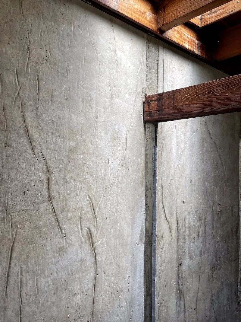 Redwood beams and built-ins – providing warmth and contrast against the cool concrete.